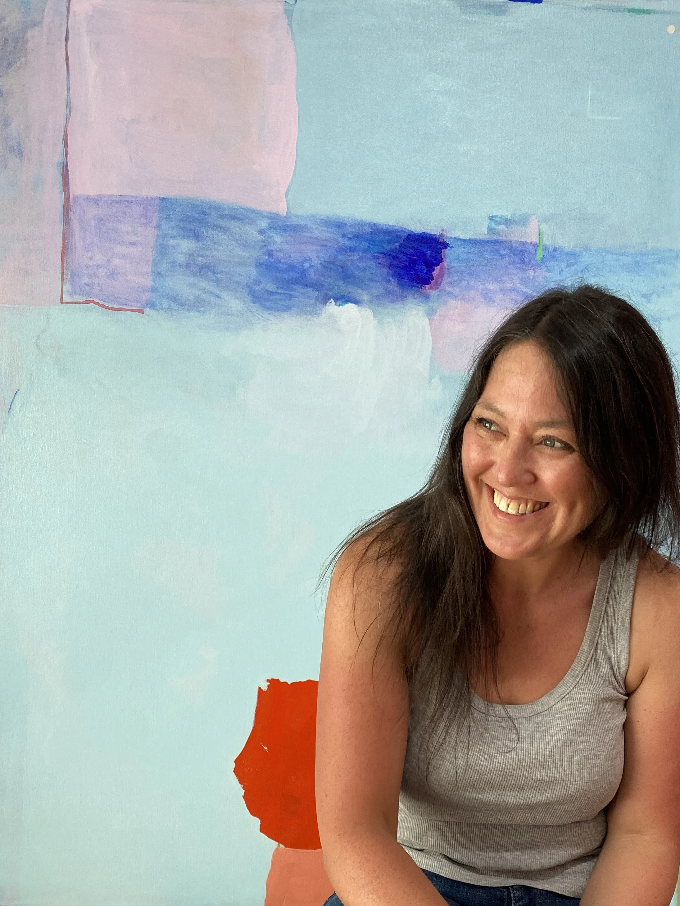 The act of painting itself is very inspiring to me. The back and forth of placing marks and stepping back to see how they fit within the work (good or not so good), and how the paintings evolve without a predetermined outcome to a resolved artwork always pulls me back to the studio–I am keen to see what happens next. I get very excited to work on large canvases. The freedom of space and to be enveloped by a larger work, a mass of colour, is my happy place. I love to see how other artists use colour and texture in their work. Sometimes when I feel stuck on a painting,I find it really helpful to look at how other artists might juxtapose colours or use a brush in a different way to me; it can help me to shift my perspective on how to approach a painting.
