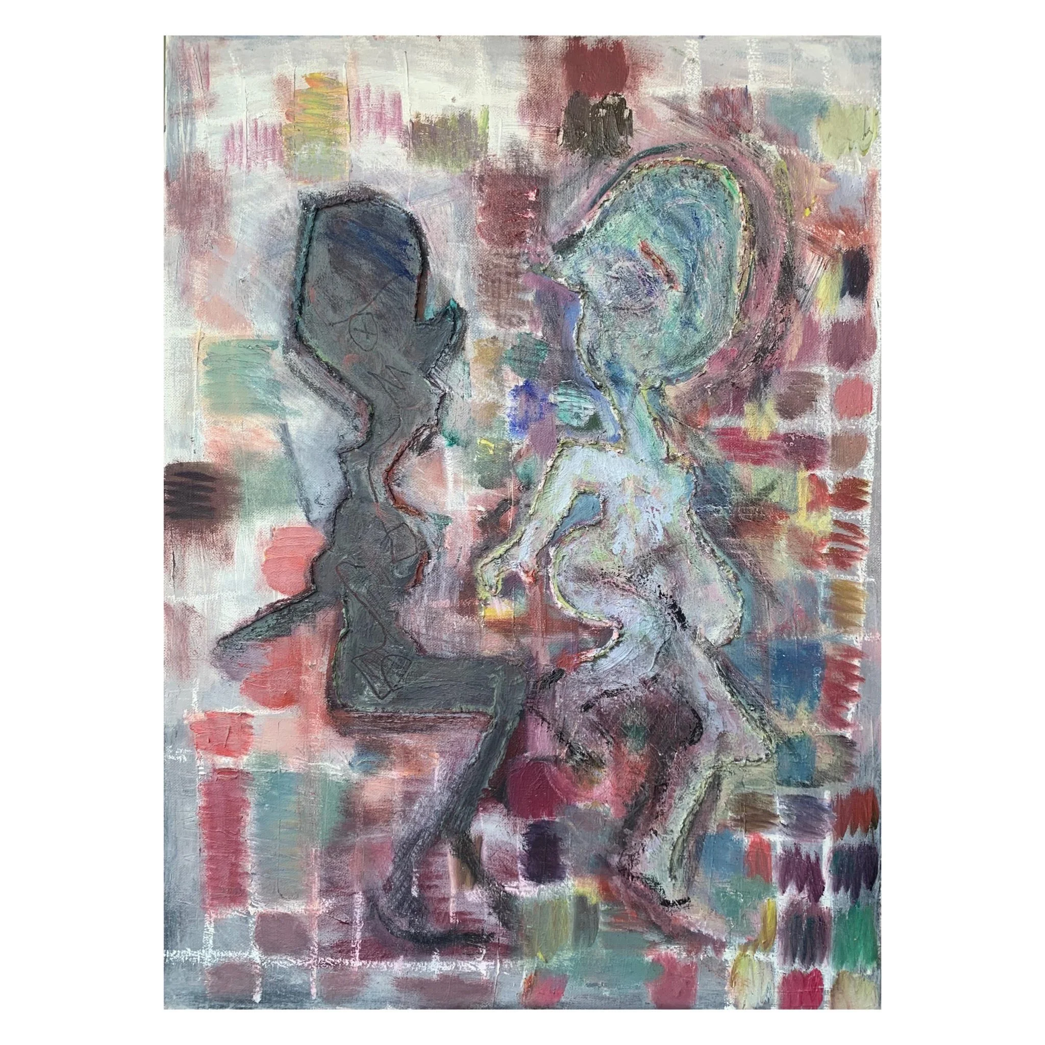 I draw almost every day, and often begin paintings with linework in a semi-figurative style that developed through years of anxious doodling. This never feels like an endpoint— not enough texture, colors too simple— so inevitably I work over the lines, winding up at some degree of abstraction. Sometimes I picture color interactions and try to realize them directly; other times I pull tubes from their storage tubs rapidly and apply paint without thought, mixing primarily on the canvas or paper. I sometimes use mediums (oleogel, cold wax medium, etc.) or thinner, but most often work with paint (oil, acrylic, enamel— rarely all three at once) as it is. I get most of my paint secondhand, and I’m excited by the natural variations in consistency of foraged supplies.