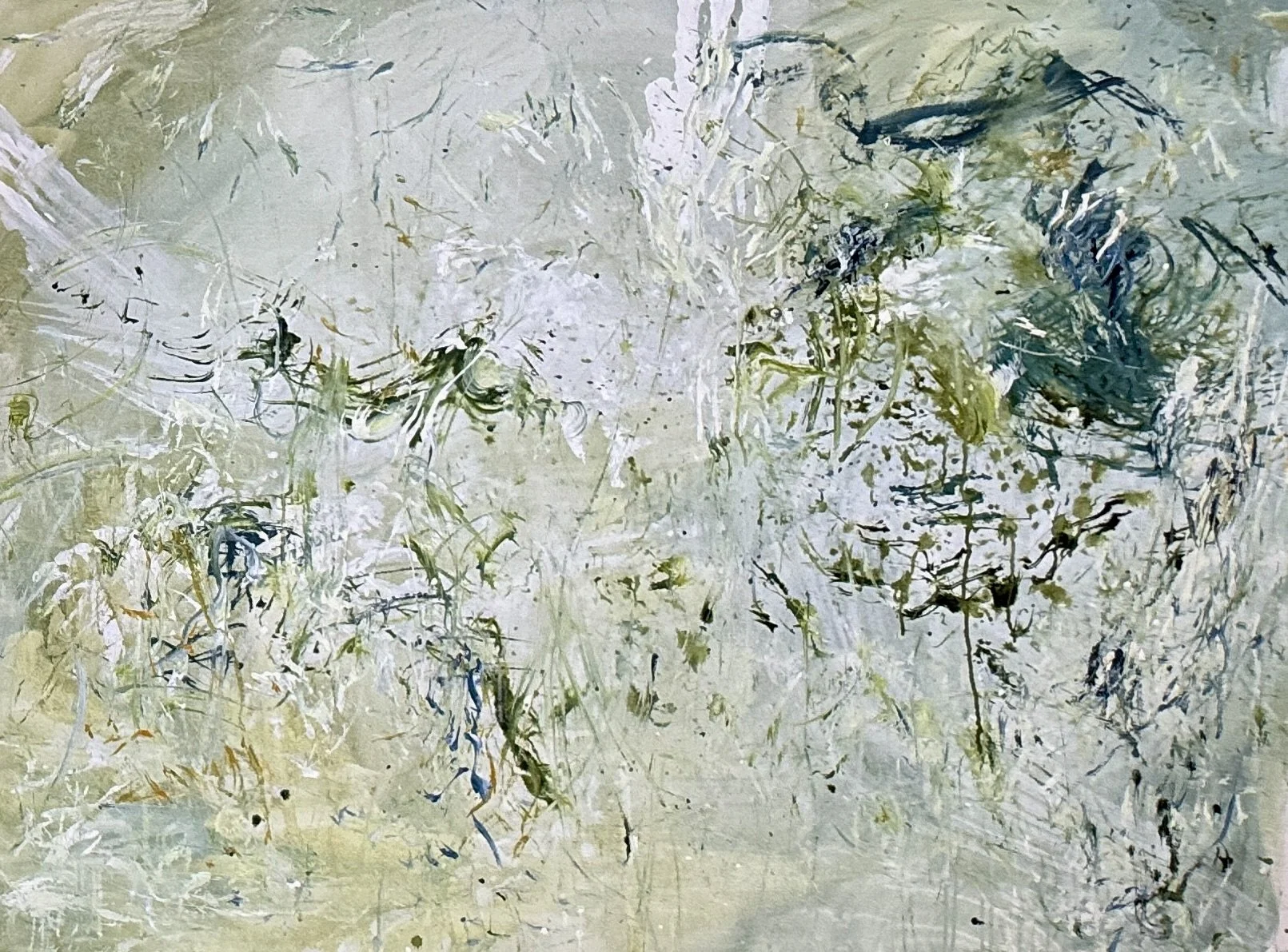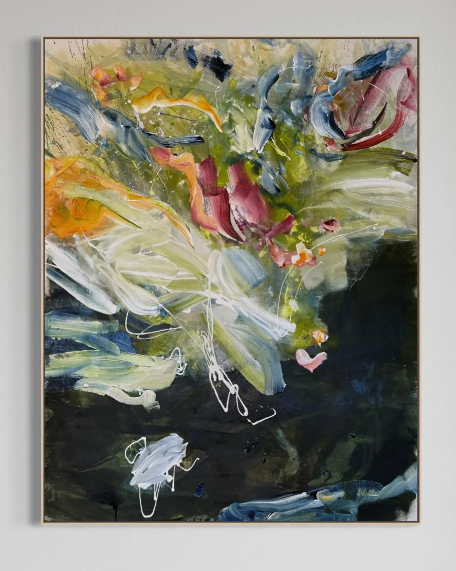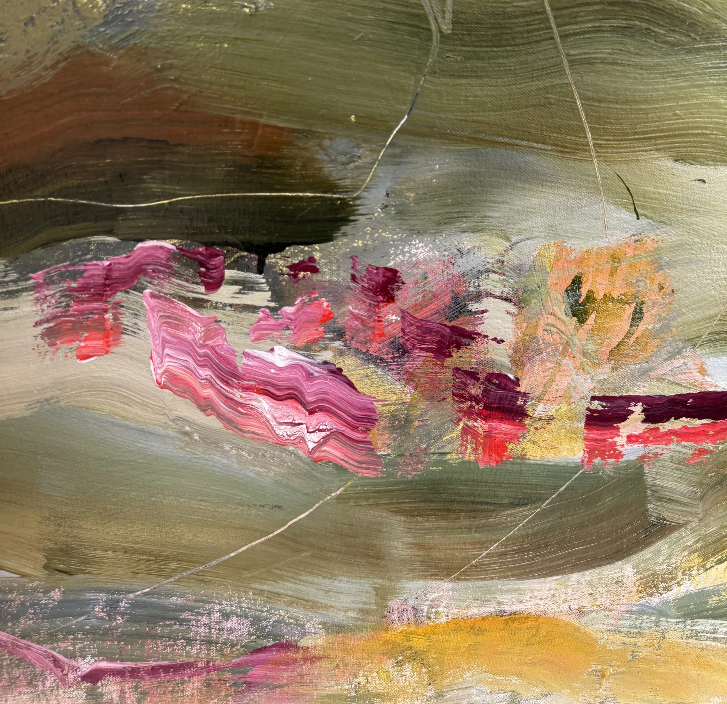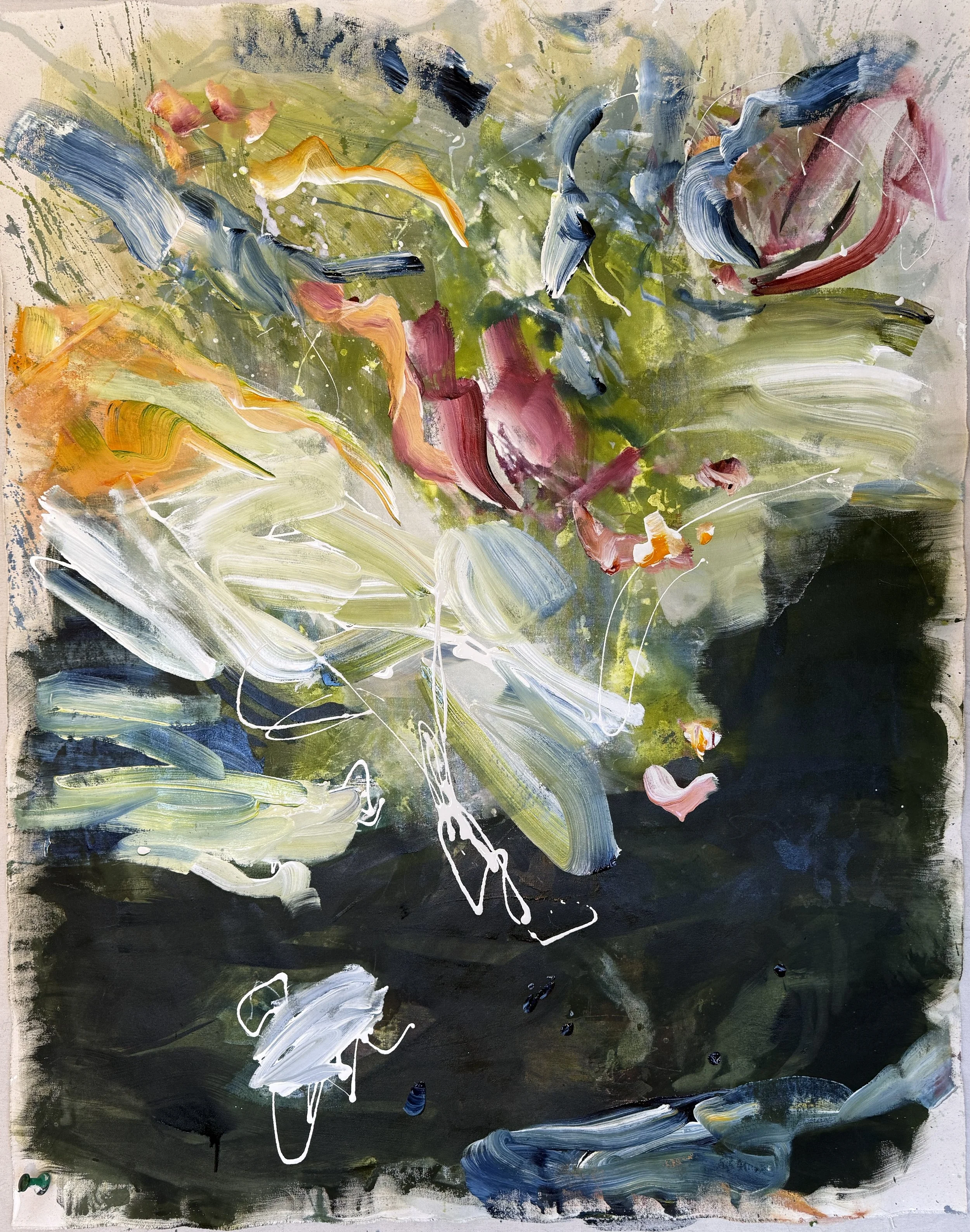 Afternoons are spent in the studio. I work in acrylic/mixed media materials on loose rolls of canvas tacked to the wall. I paint mostly intuitively dropping into a flow state of curiosity and wonder.