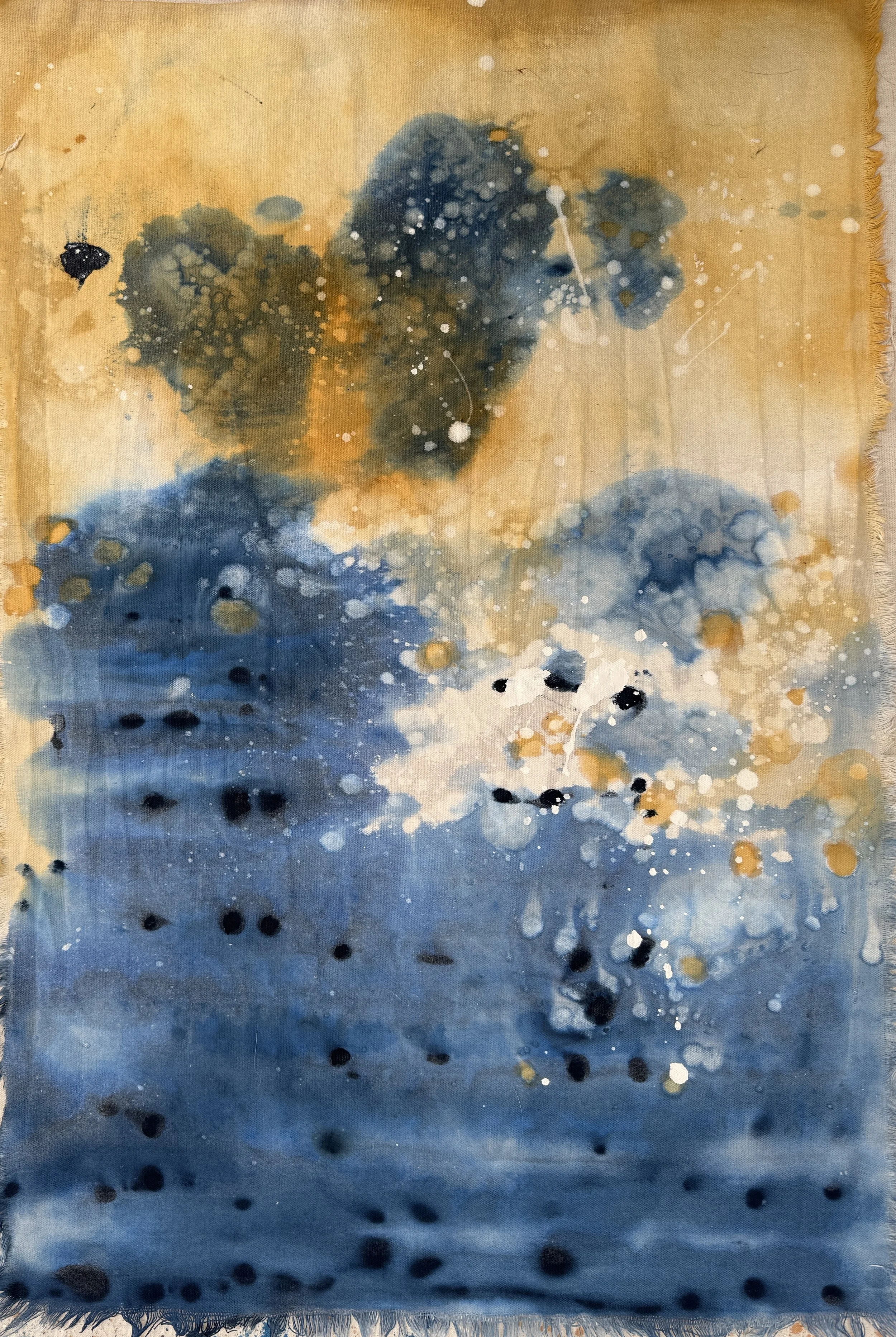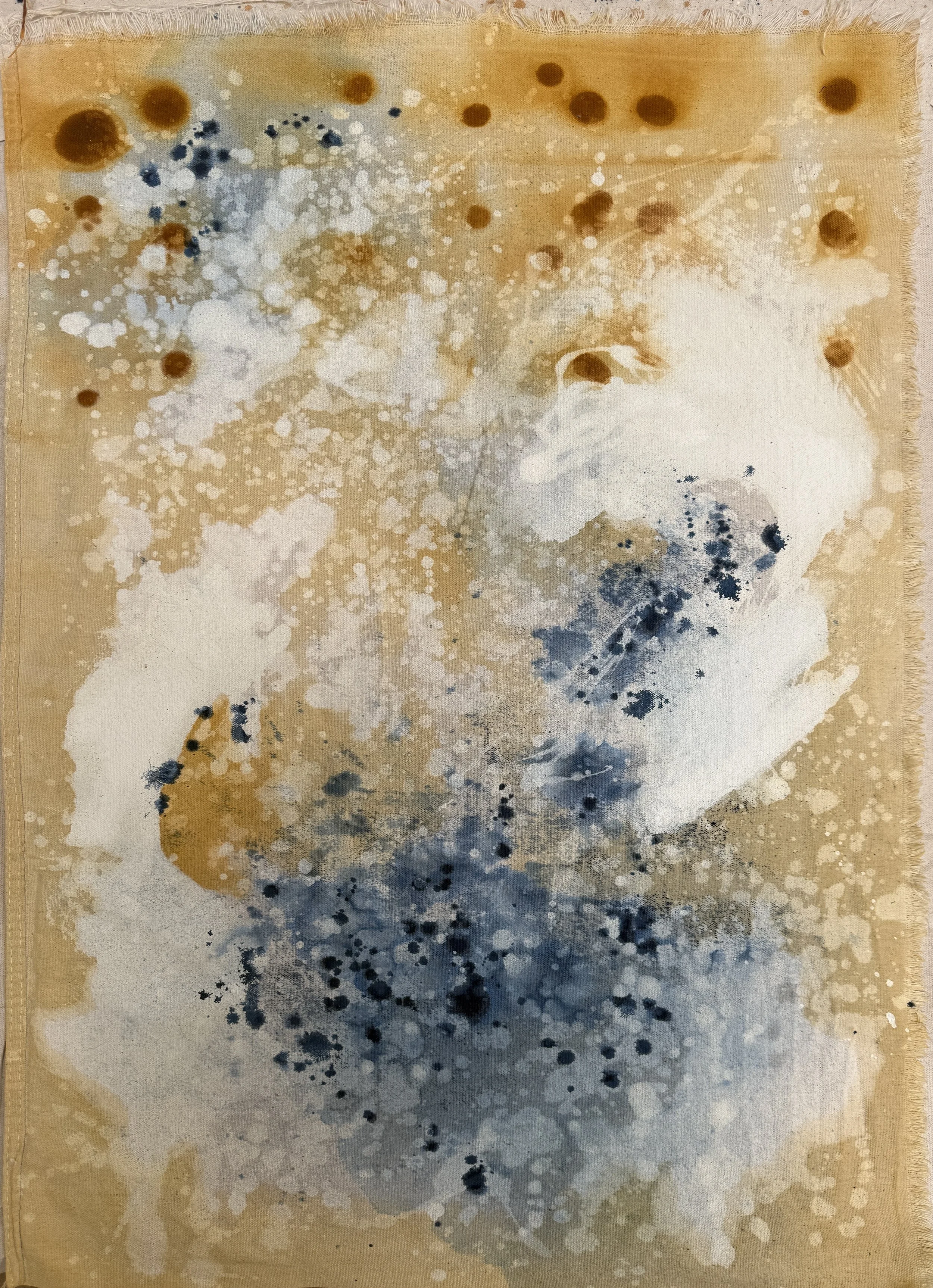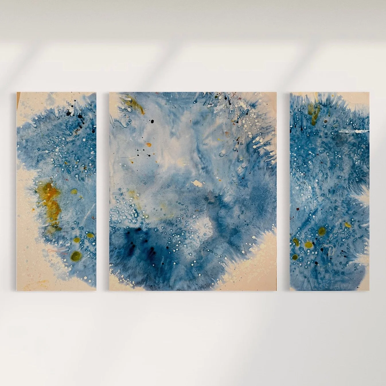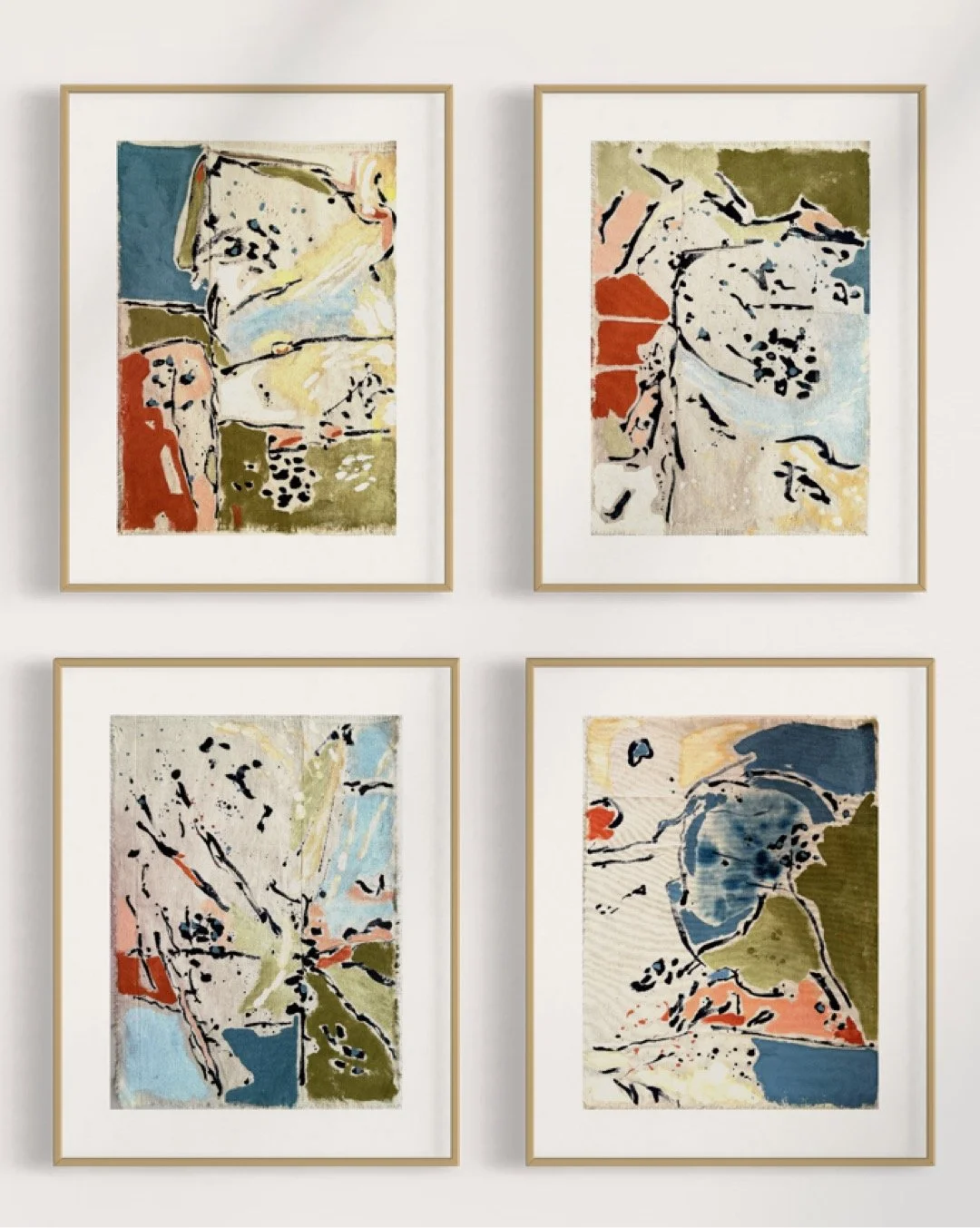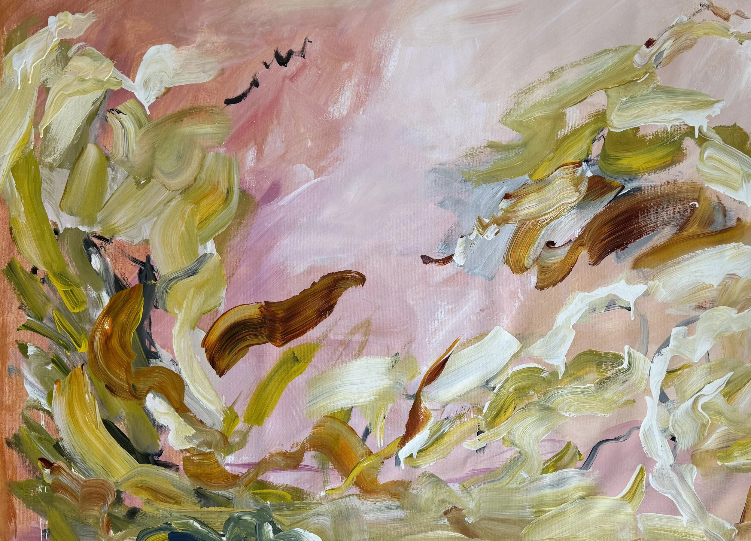 Afternoons are spent in the studio. I work in acrylic/mixed media materials on loose rolls of canvas tacked to the wall. I paint mostly intuitively dropping into a flow state of curiosity and wonder.