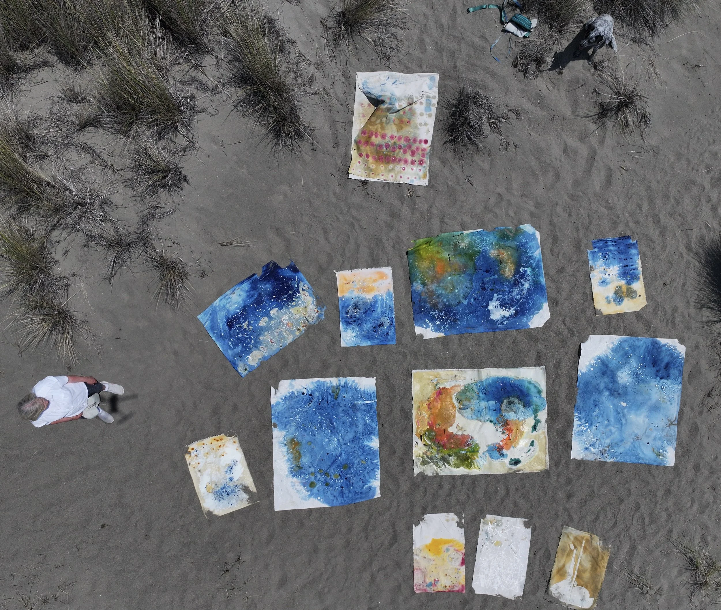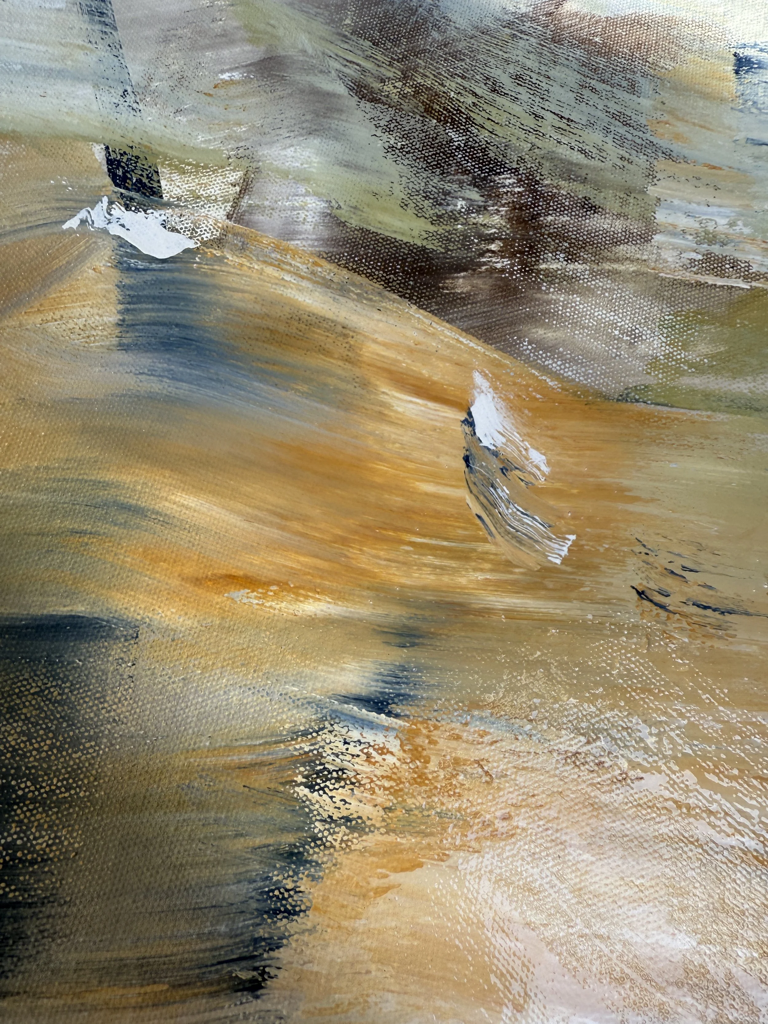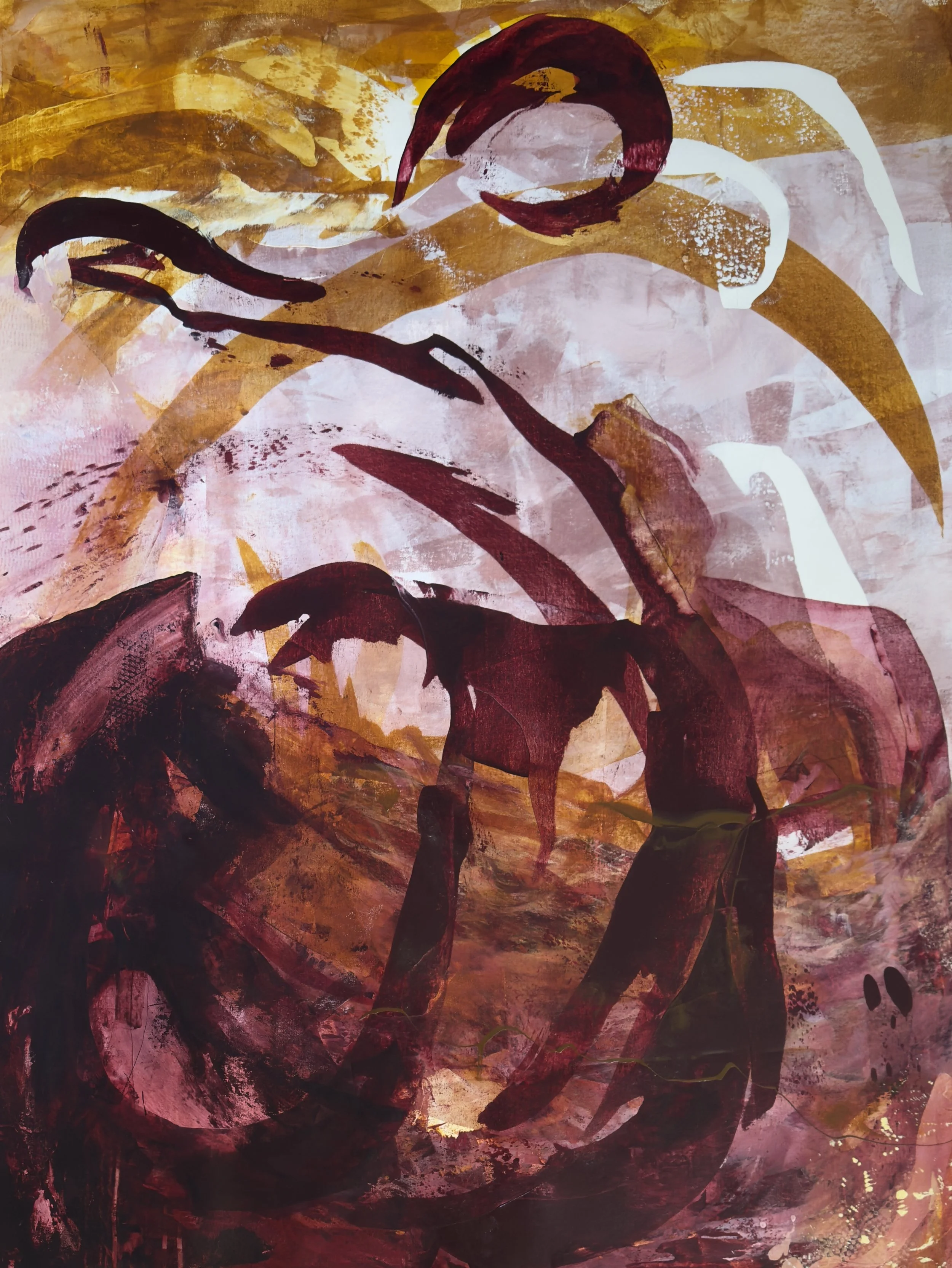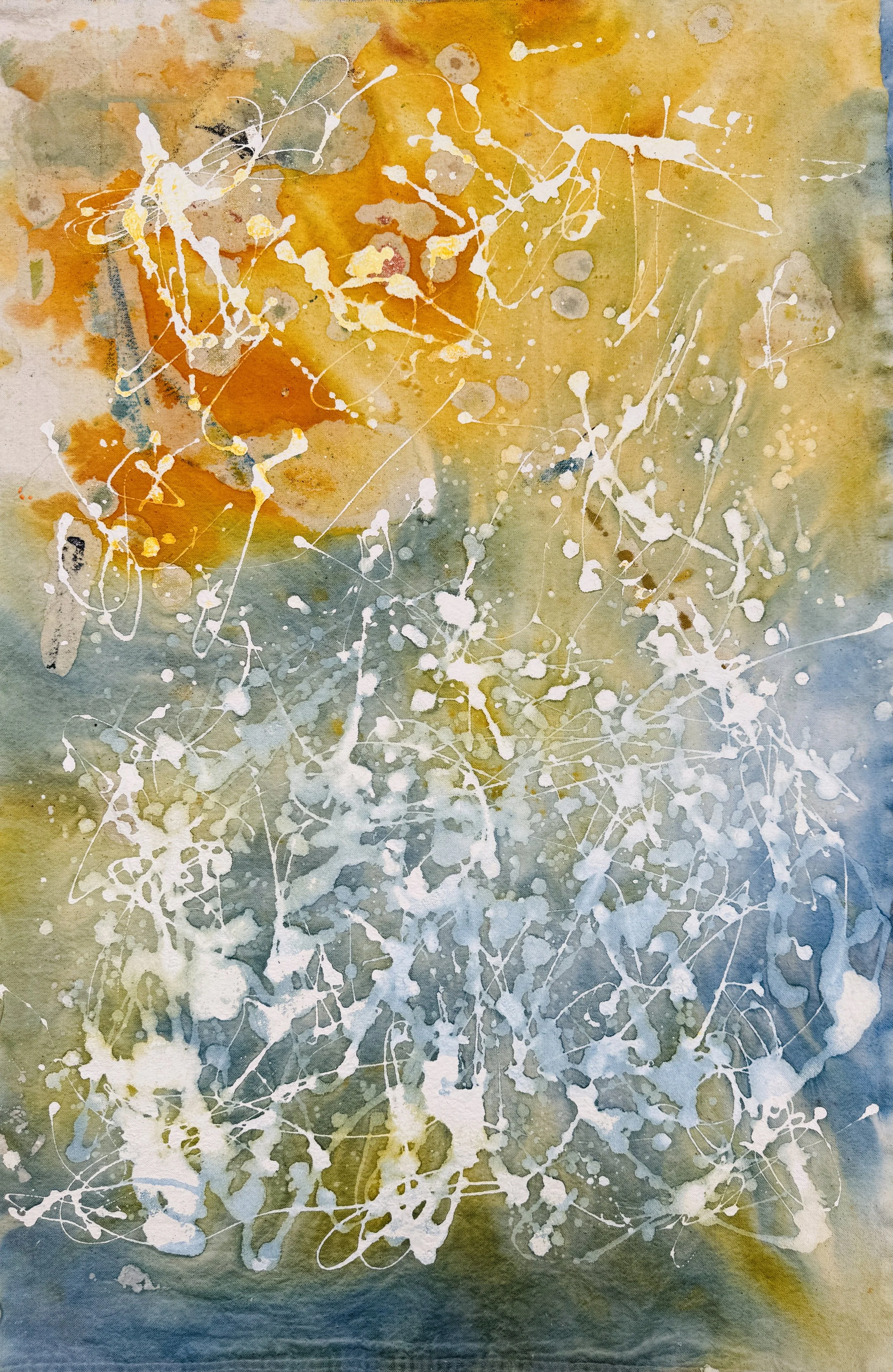 Afternoons are spent in the studio. I work in acrylic/mixed media materials on loose rolls of canvas tacked to the wall. I paint mostly intuitively dropping into a flow state of curiosity and wonder.