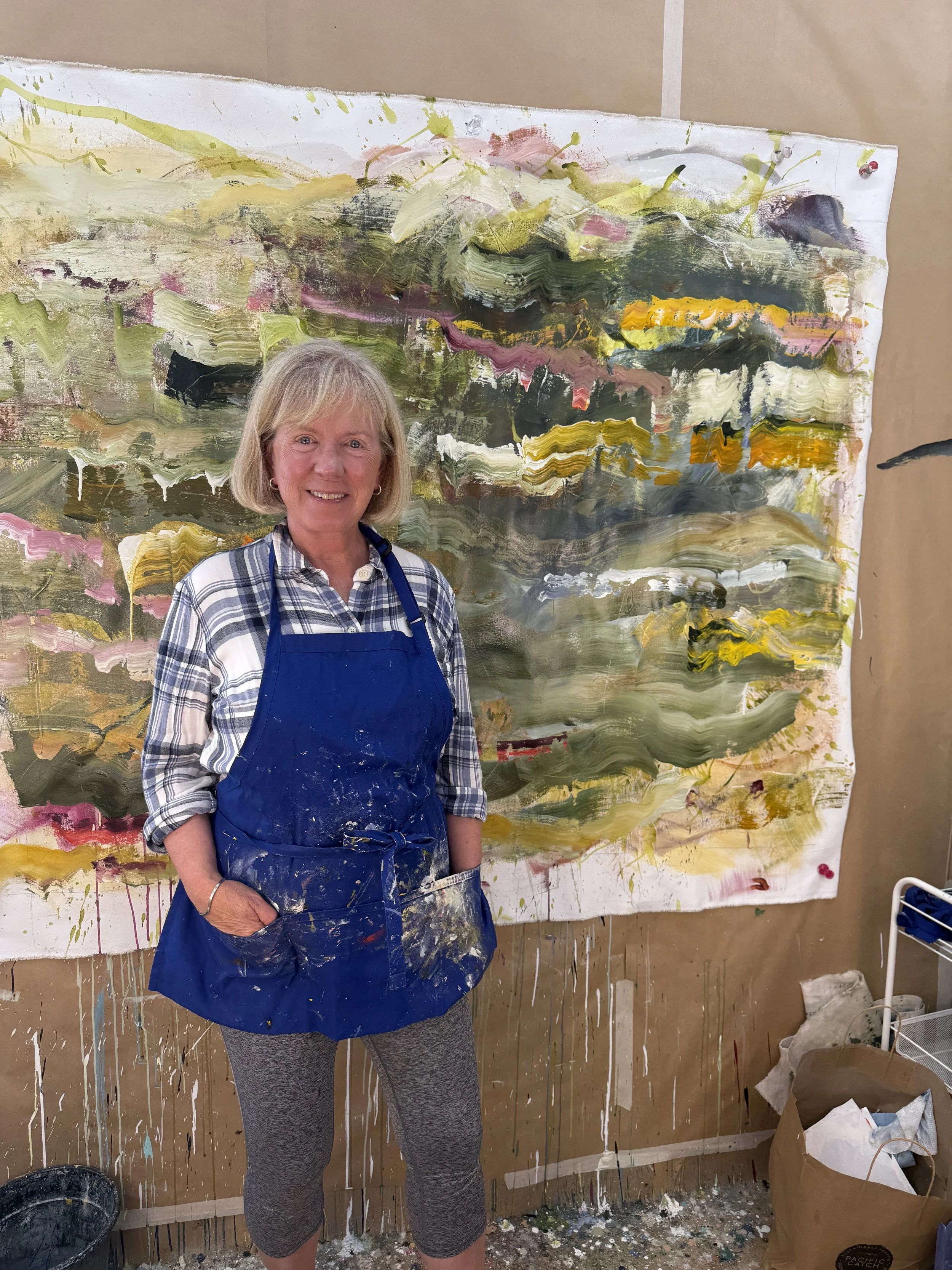 I can’t sit at a table and make art……I need to move. I keep my palette across the studio so I can stay in motion. I always have music playing. Often words strung together in melody weave themselves into a painting and become part of how my work is titled.
