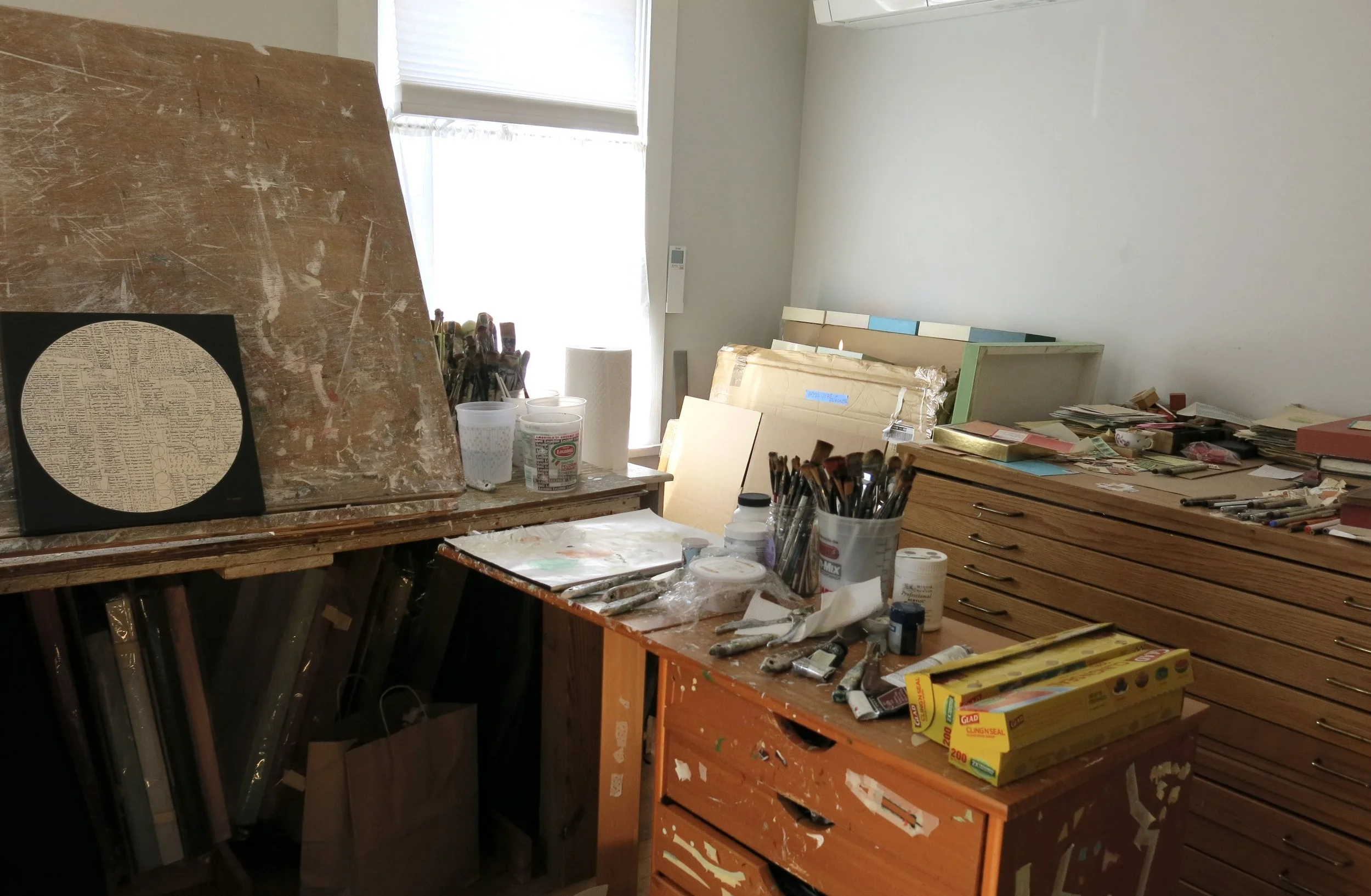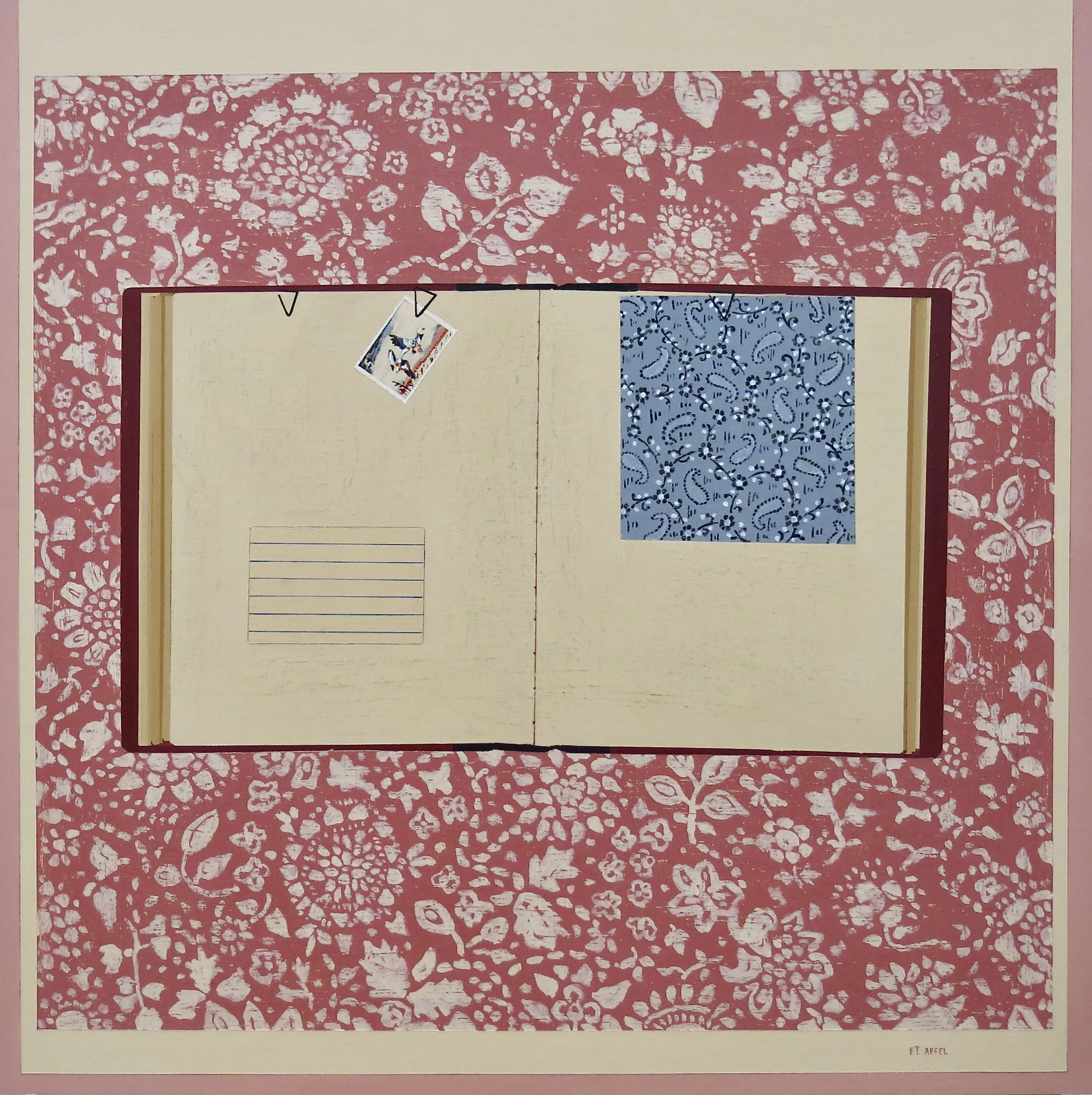 I work on wood panels. After I gesso and prime the boards, the first thing I do is cover all that whiteness – which I find very intimidating - and paint multiple layers of colors. Sometime I know exactly what I am going to do next – and other times, I have no idea. I sift through my many letters, envelopes and memorabilia in my studio and start to make decisions. I have a few series I work on - so I am also always deciding what series to work on and how I will develop this particular picture. If I am painting a lot of letters and envelopes, I always start with whatever is on top.
