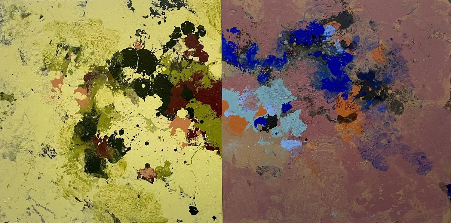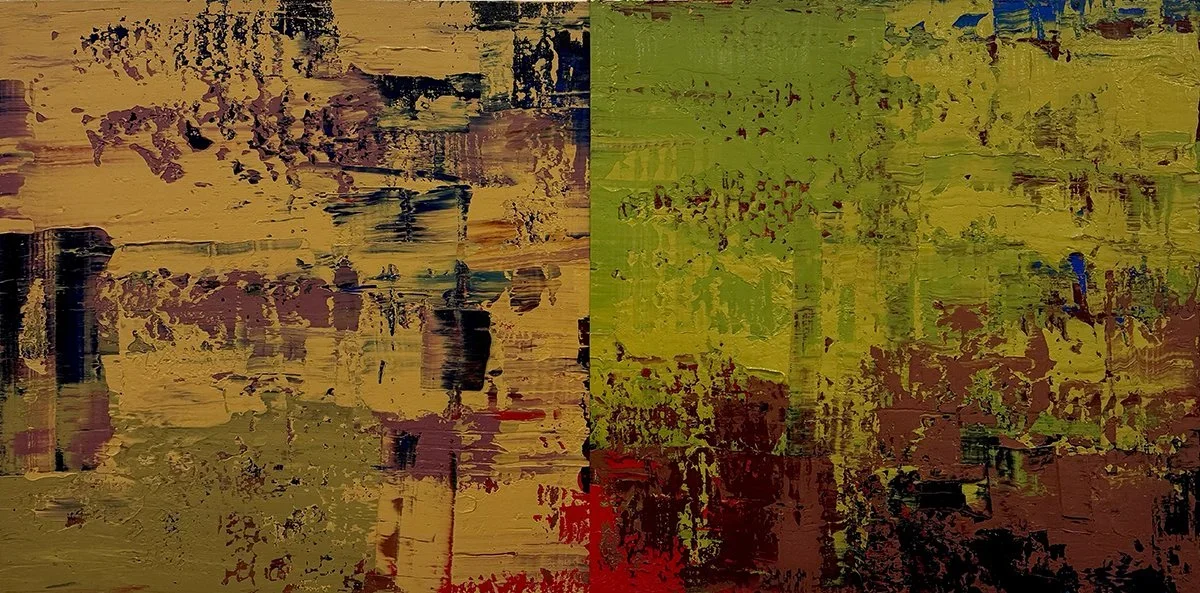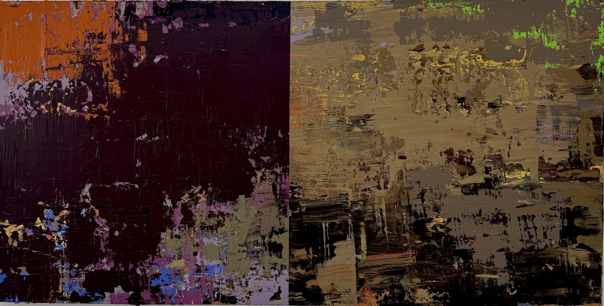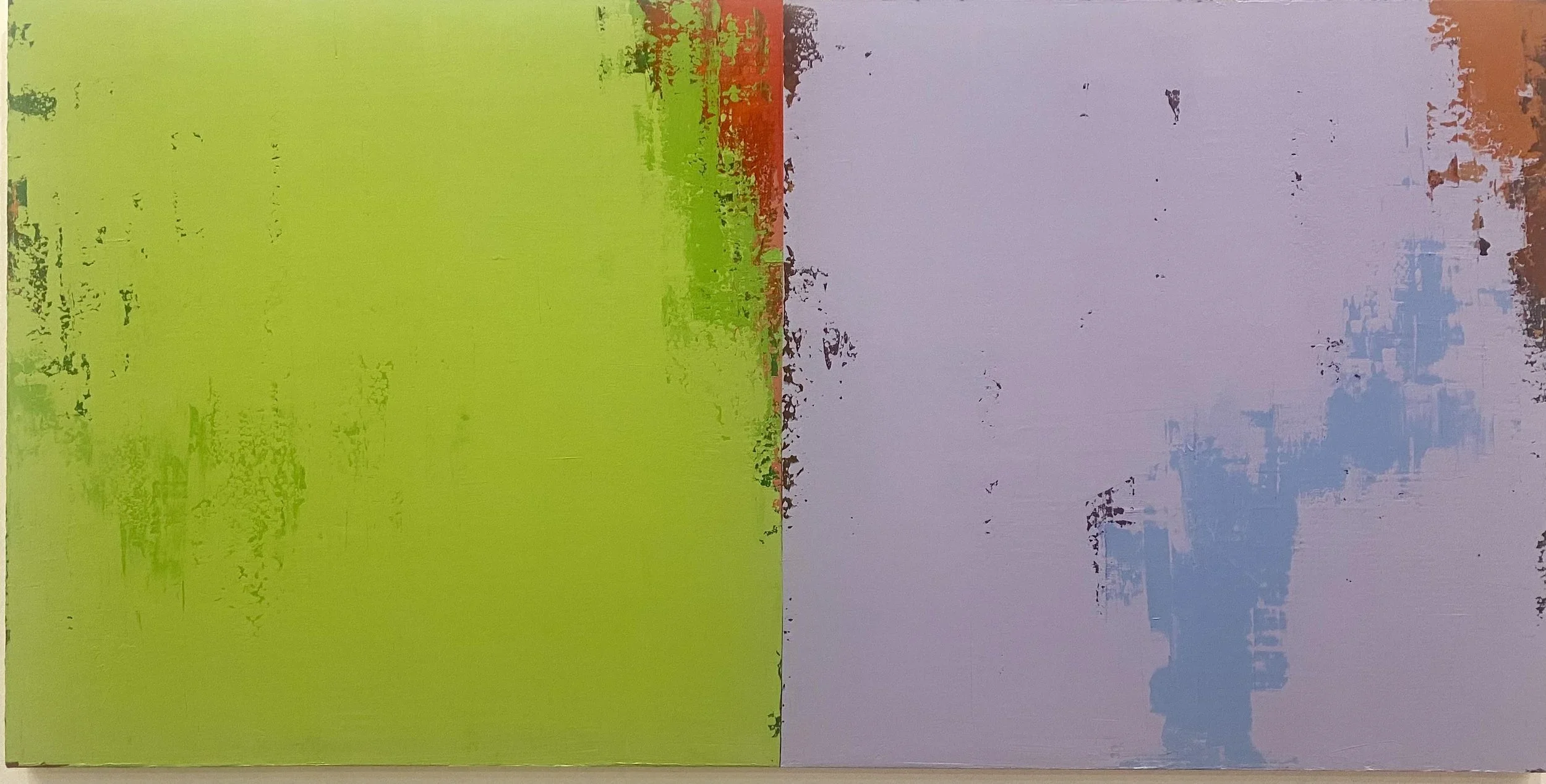 My current series, “dichotomies” is all about color and color relationships. I’ve also tried to eliminate the notion of “foreground” and “background.” It started with a very minimal mindset – seeing how little I could do to create a complete thought or feeling. Later versions are much more atmospheric or organic. Most recently, I’ve thickened the paint and kind of tortured it into exposing all kinds of mysterious random incidents within the context of a strict geometric composition.