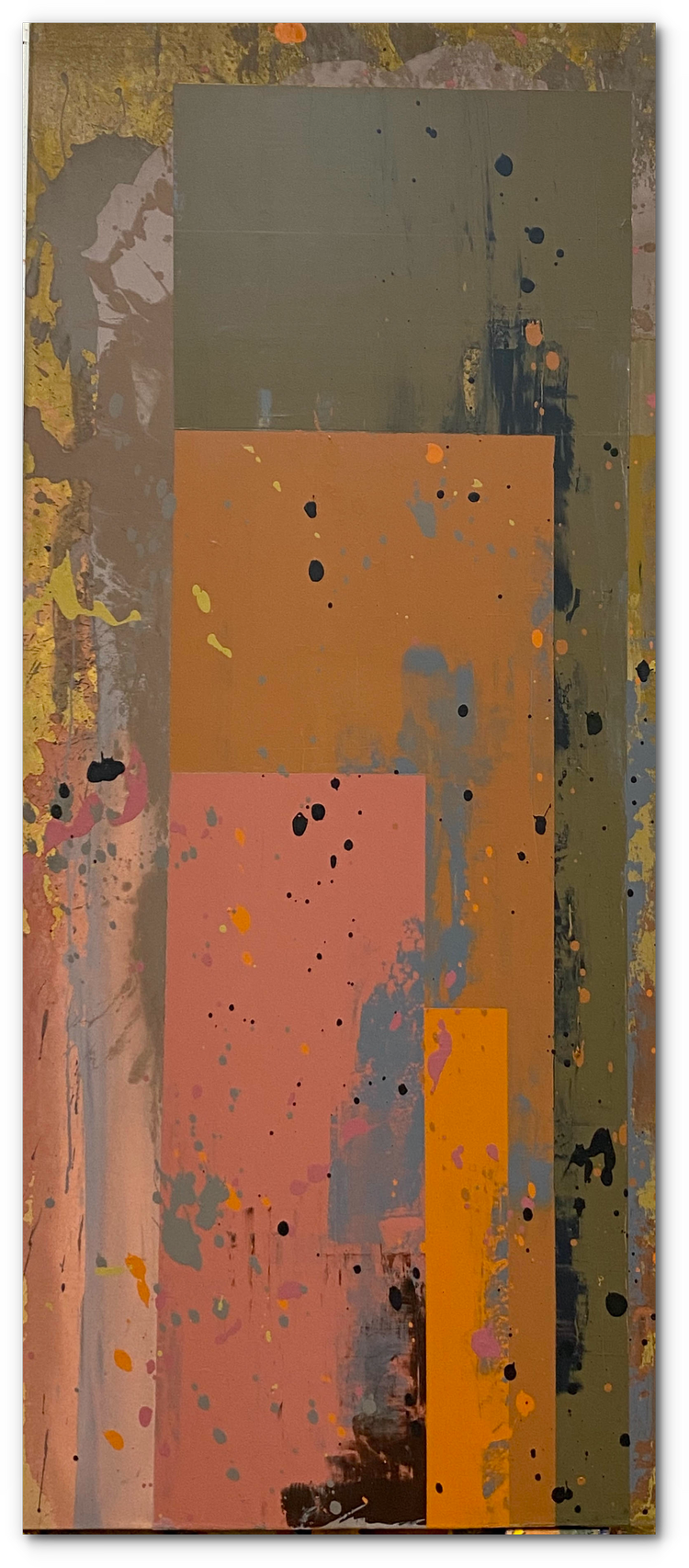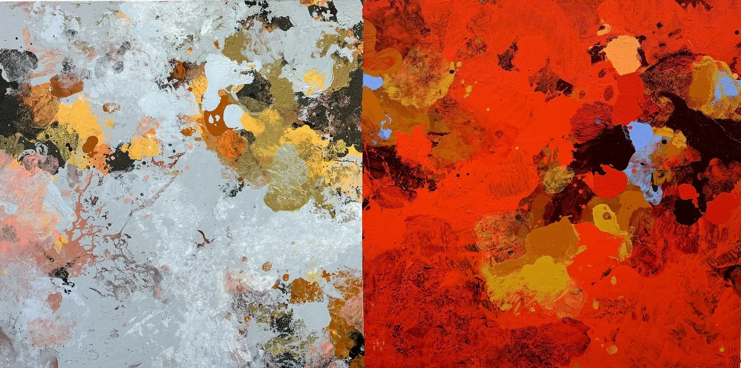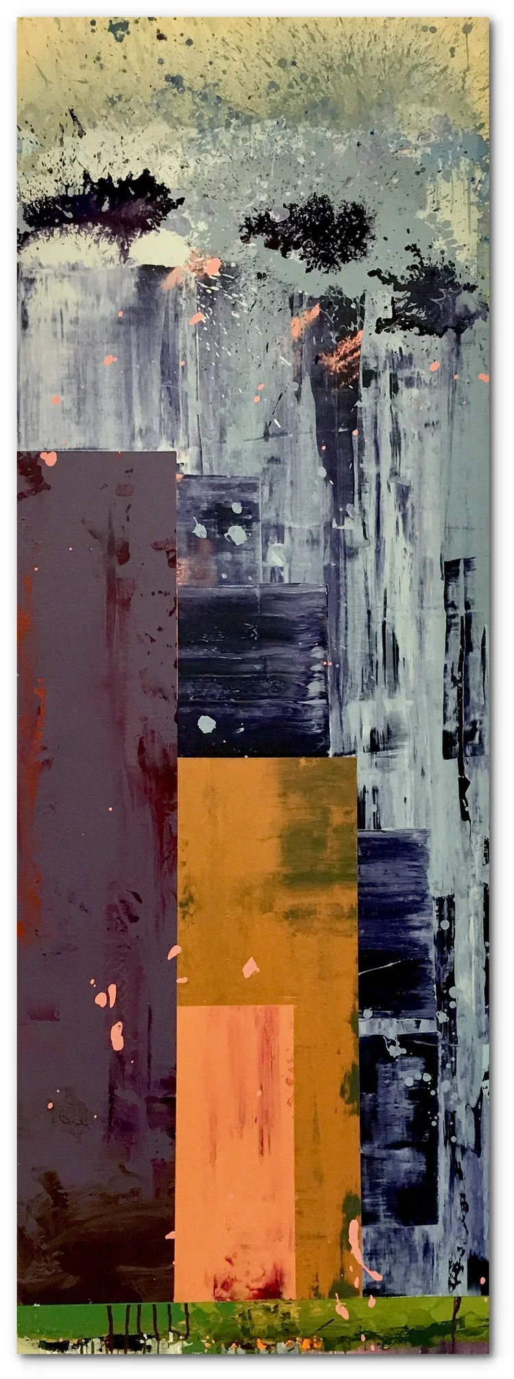 My current series, “dichotomies” is all about color and color relationships. I’ve also tried to eliminate the notion of “foreground” and “background.” It started with a very minimal mindset – seeing how little I could do to create a complete thought or feeling. Later versions are much more atmospheric or organic. Most recently, I’ve thickened the paint and kind of tortured it into exposing all kinds of mysterious random incidents within the context of a strict geometric composition.