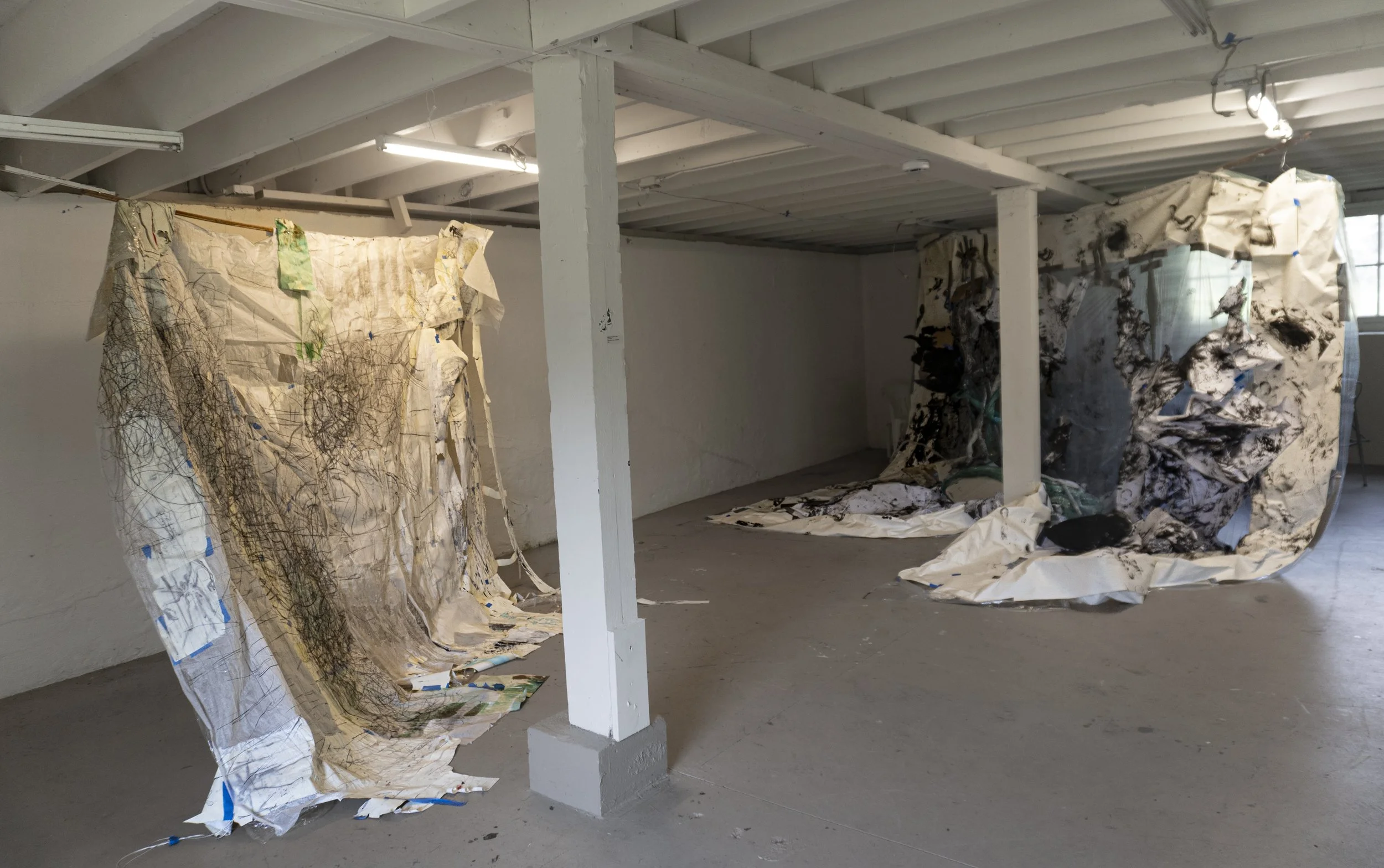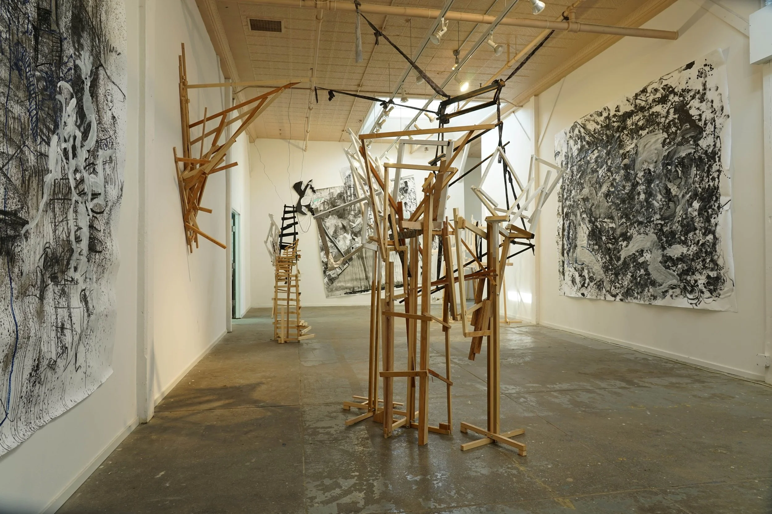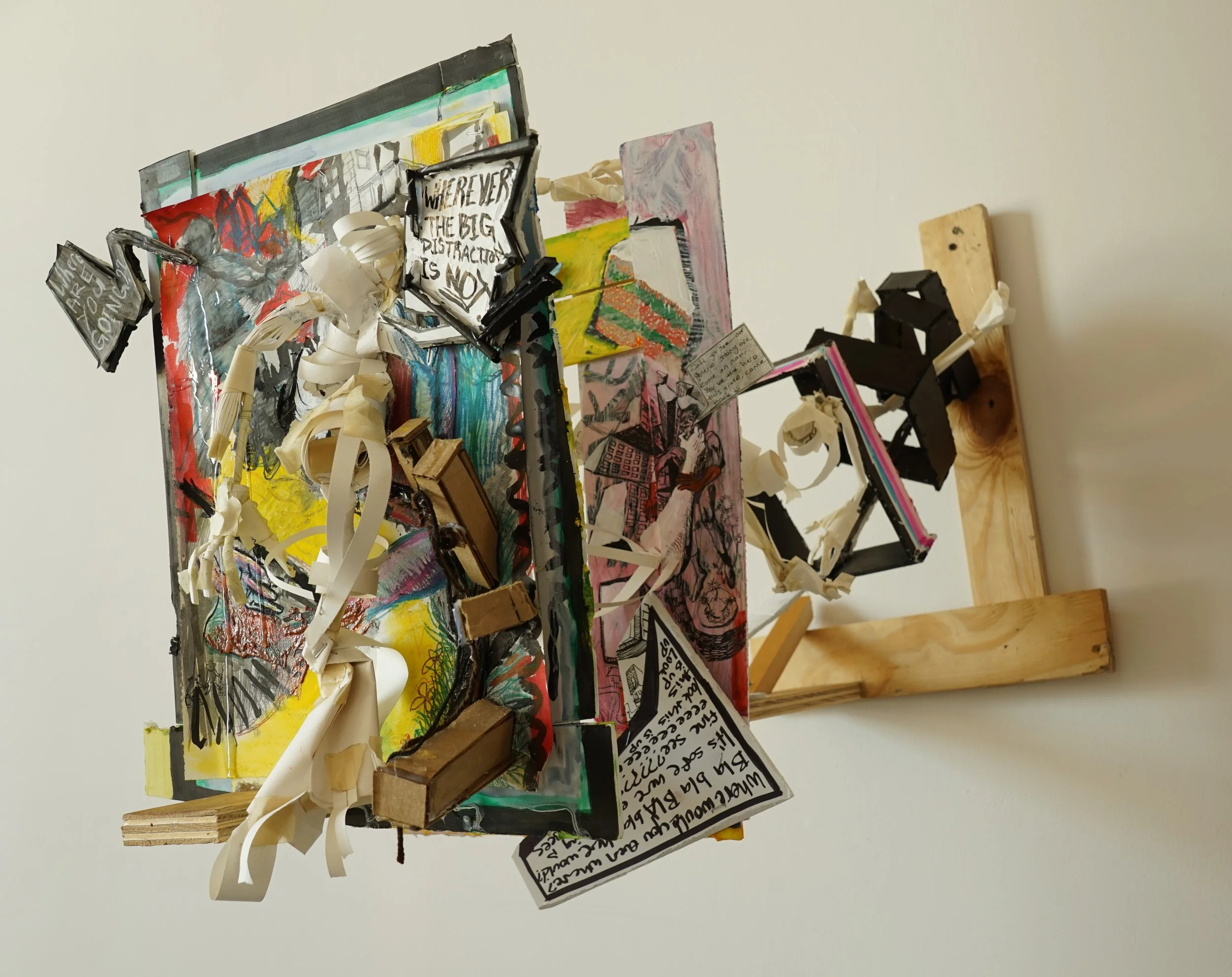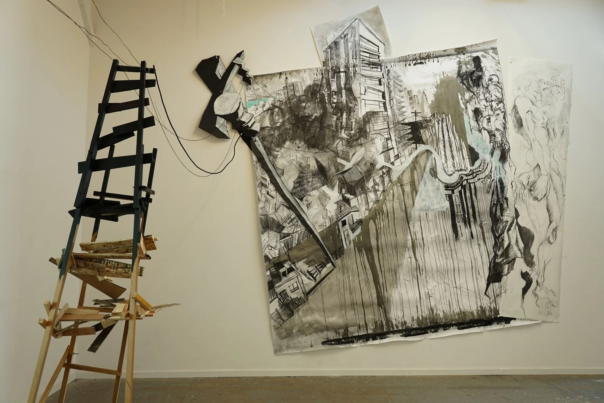 I dismember the comic book’s rectangular and grid-like narrative structure which has informed much of my personal code of the world. I break the composition of the grid by drawing, then collage, and through this process I land on sculpture and installation made out of materials used in the first steps of building like paper and wood. In these installations, I get to explore the junction of our bodies in rooms and spaces that confront the regular aesthetics of buildings we claim to be safe. Though recently, video, fabrics, and performance has entered my realm of making and I am still in the middle of finding my footing with these materials and practices.