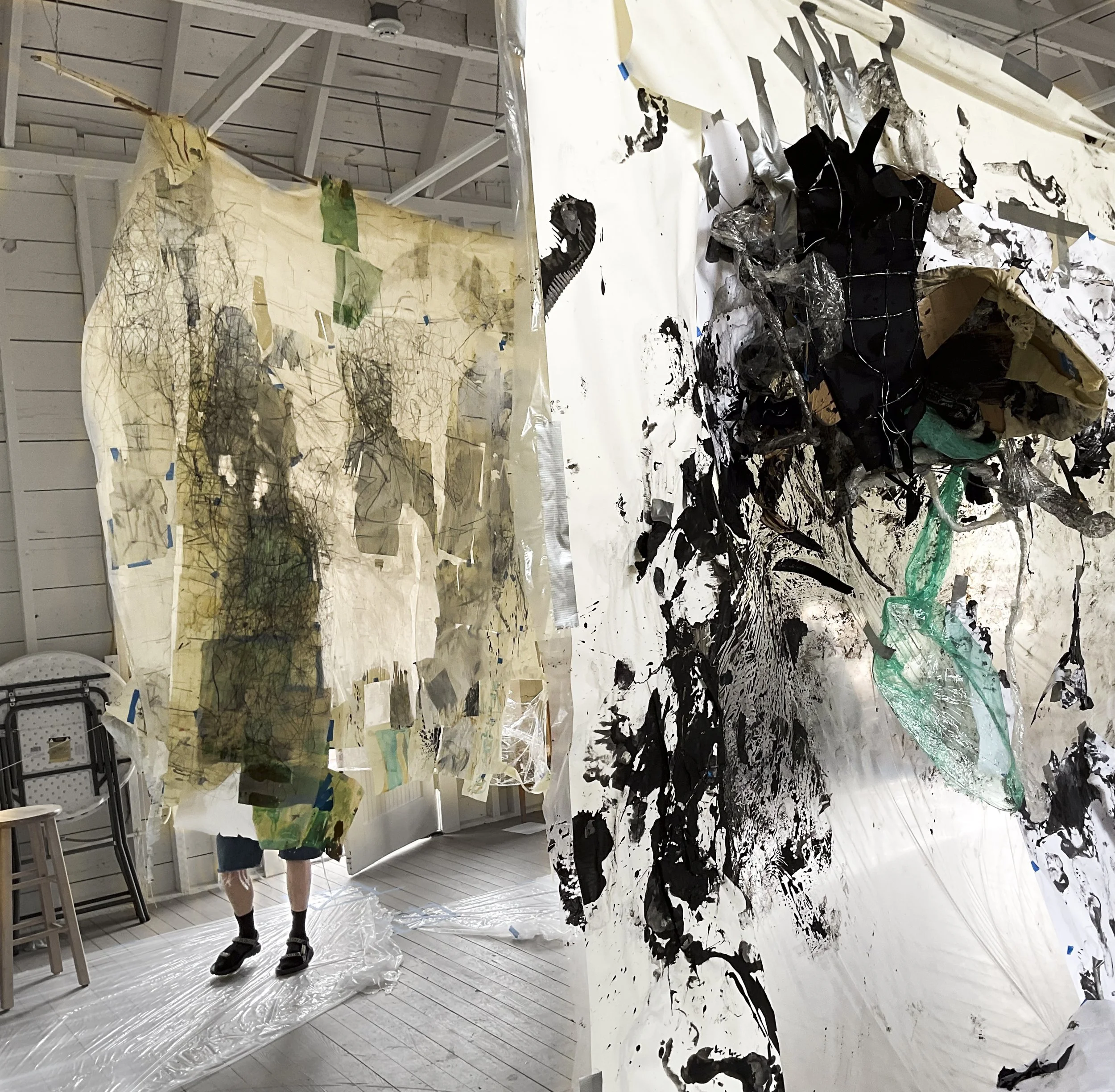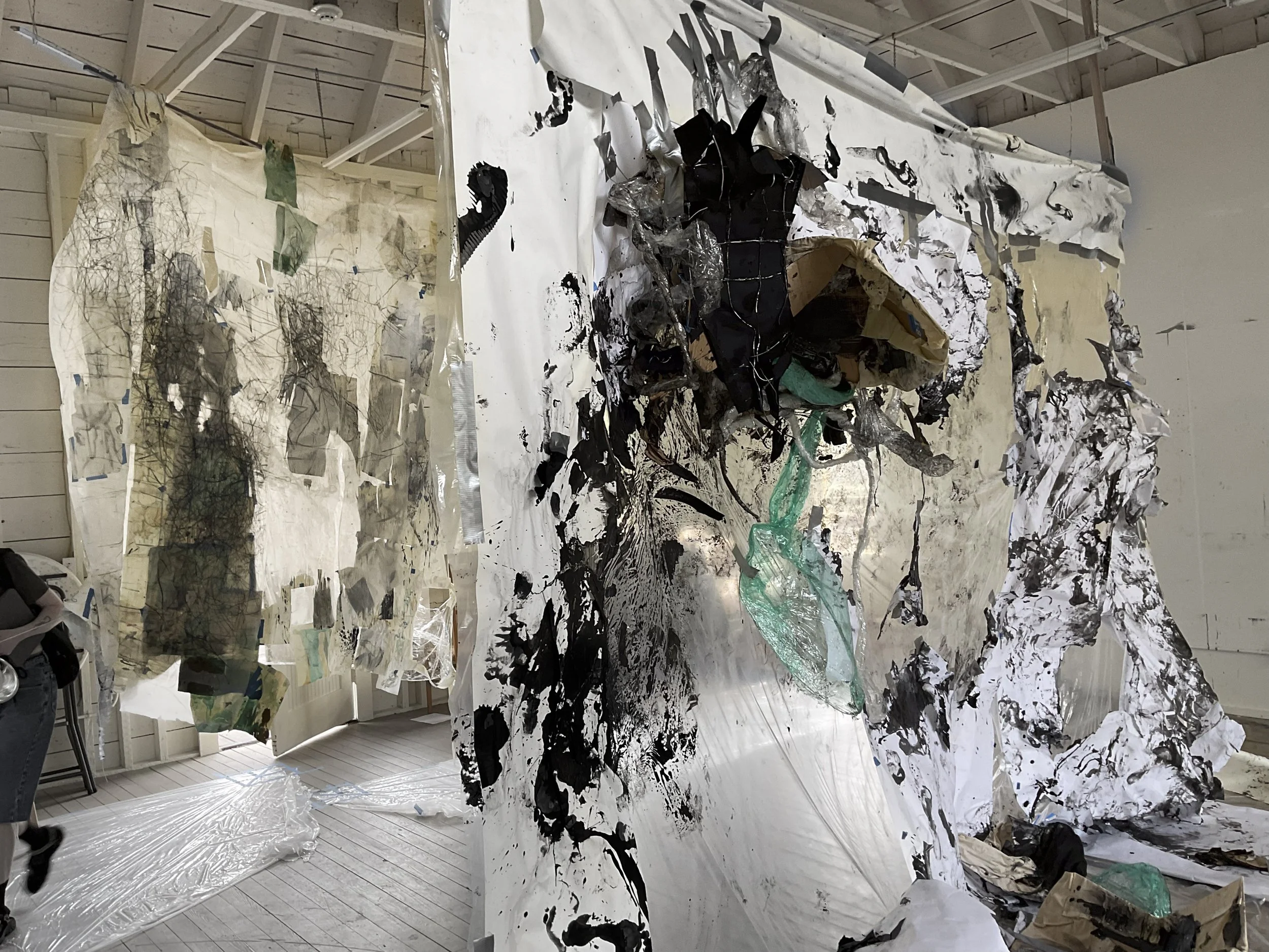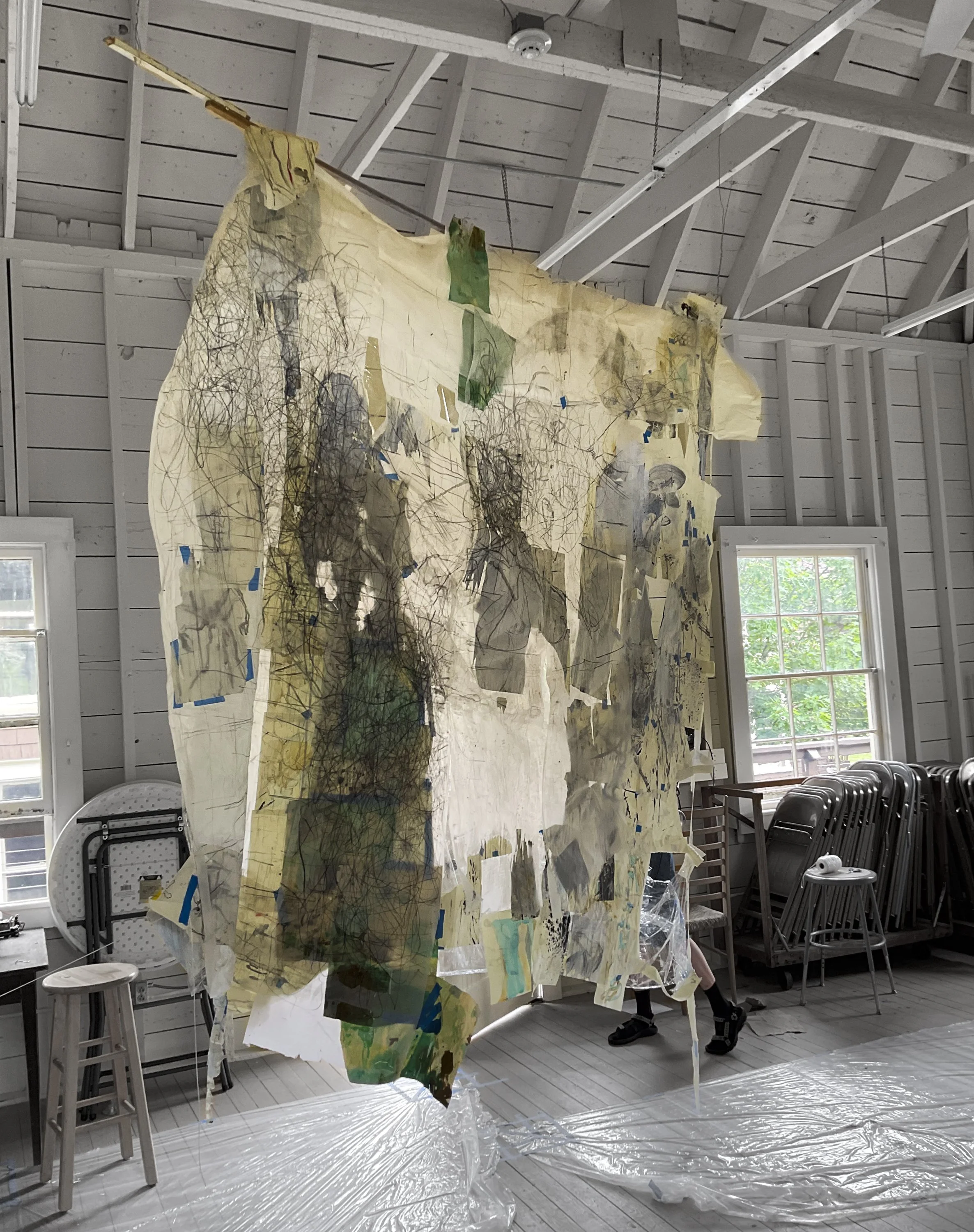 I dismember the comic book’s rectangular and grid-like narrative structure which has informed much of my personal code of the world. I break the composition of the grid by drawing, then collage, and through this process I land on sculpture and installation made out of materials used in the first steps of building like paper and wood. In these installations, I get to explore the junction of our bodies in rooms and spaces that confront the regular aesthetics of buildings we claim to be safe. Though recently, video, fabrics, and performance has entered my realm of making and I am still in the middle of finding my footing with these materials and practices.