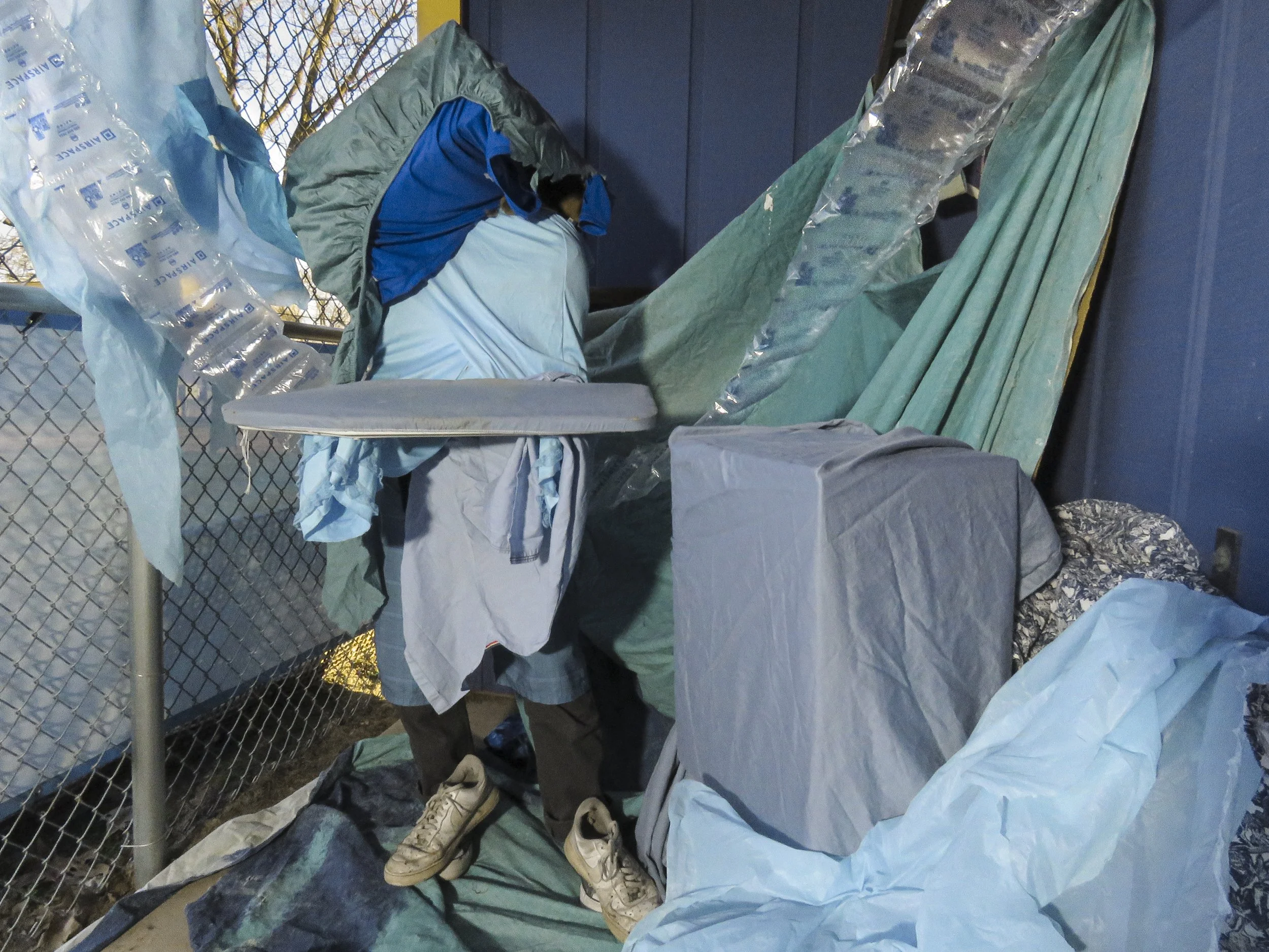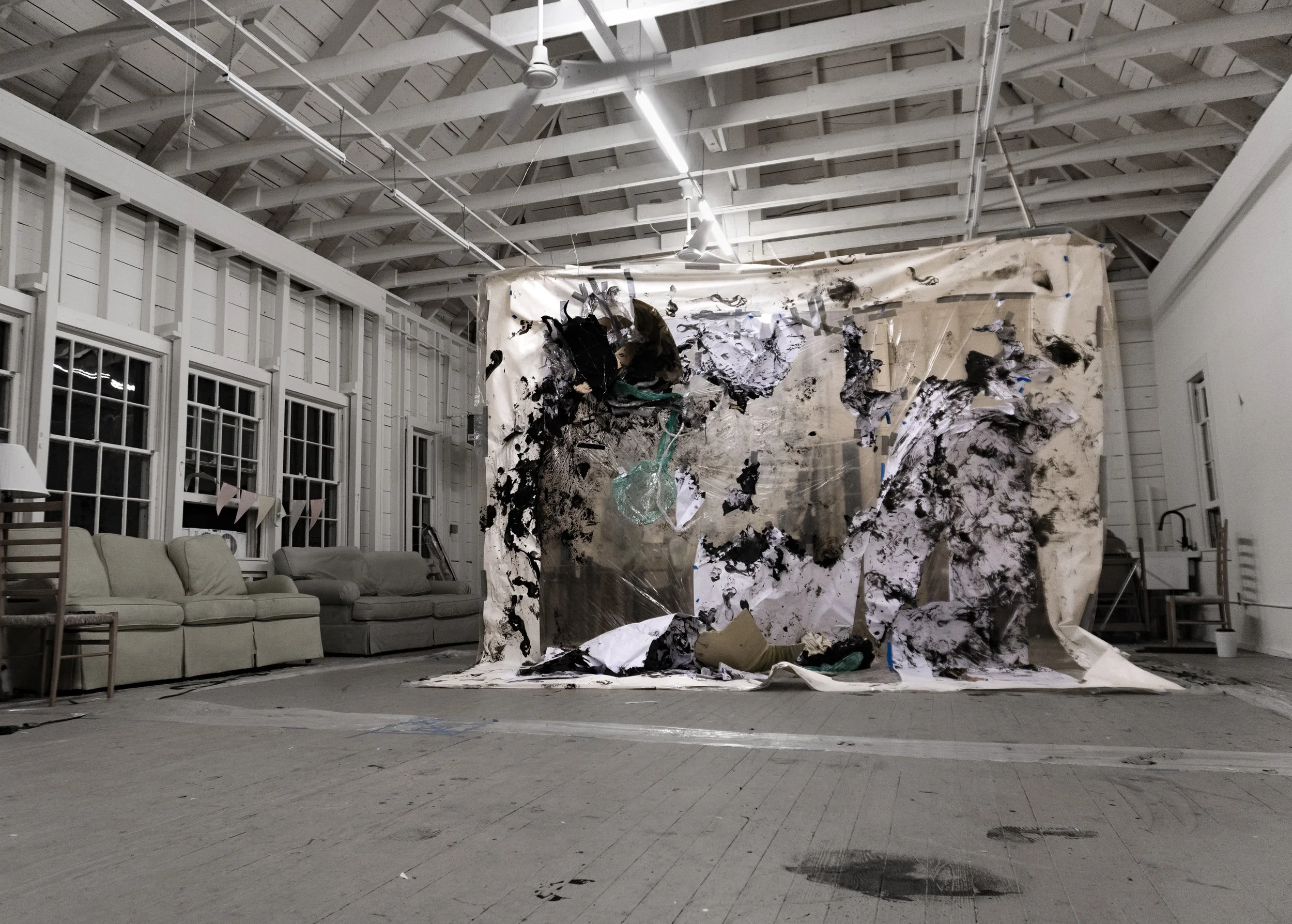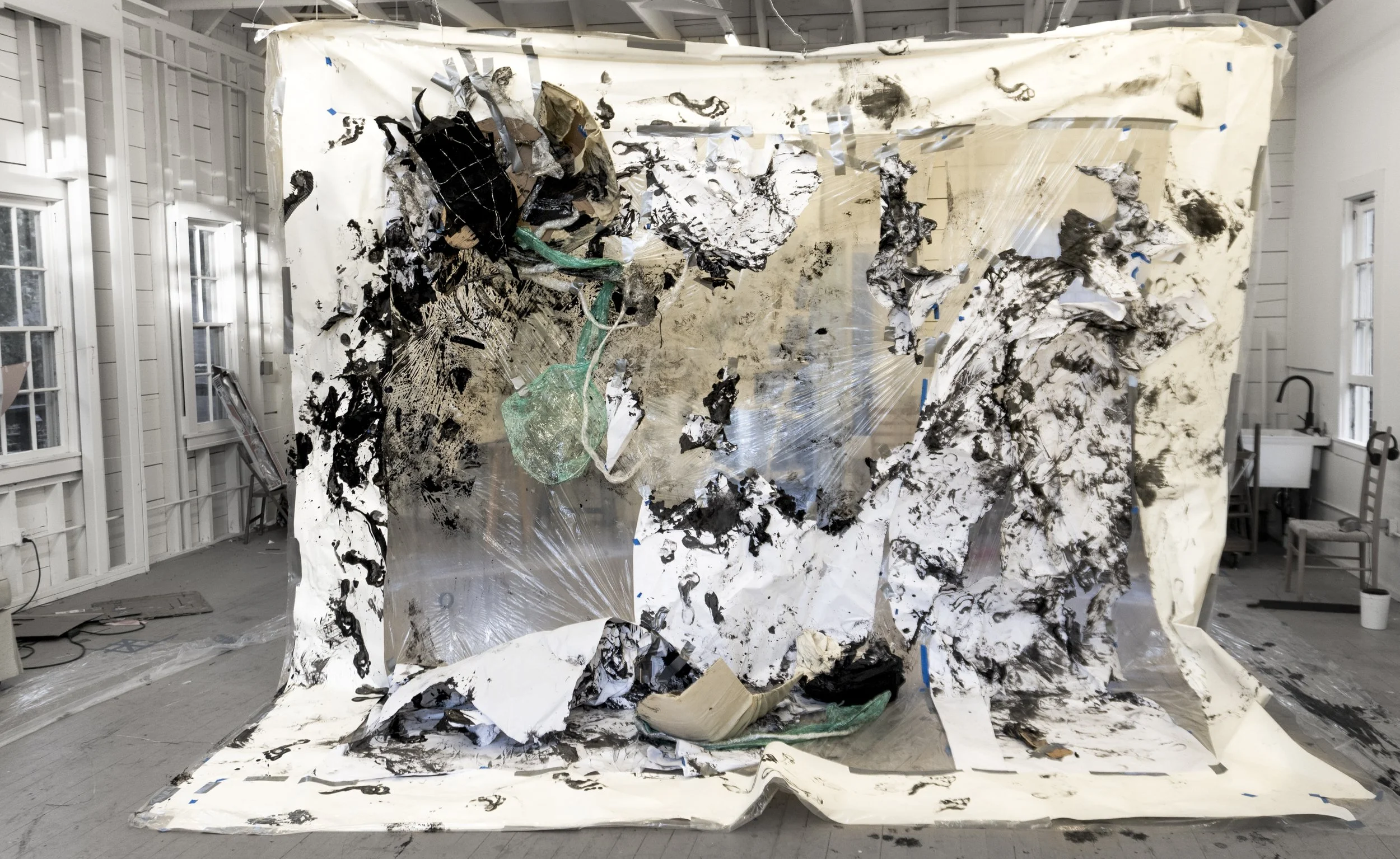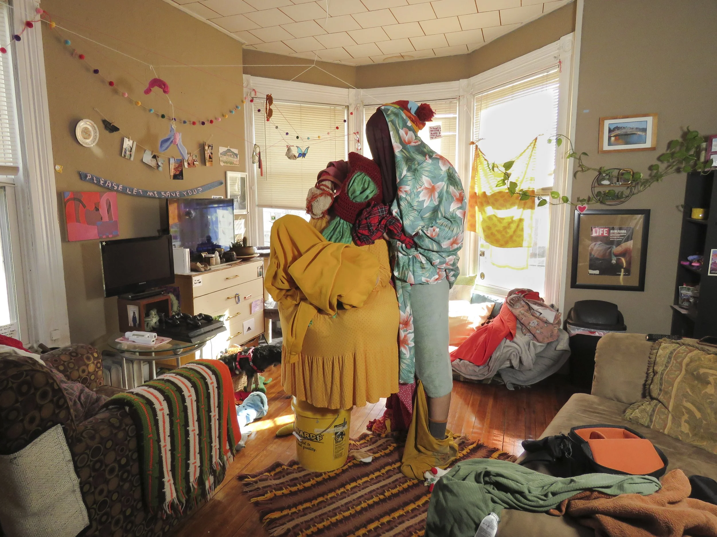 I dismember the comic book’s rectangular and grid-like narrative structure which has informed much of my personal code of the world. I break the composition of the grid by drawing, then collage, and through this process I land on sculpture and installation made out of materials used in the first steps of building like paper and wood. In these installations, I get to explore the junction of our bodies in rooms and spaces that confront the regular aesthetics of buildings we claim to be safe. Though recently, video, fabrics, and performance has entered my realm of making and I am still in the middle of finding my footing with these materials and practices.
