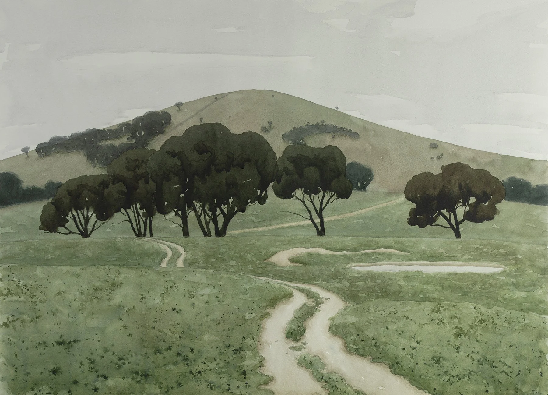 My process involves a lot of preliminary work before I make a "final" painting. This usually begins with quick little thumbnail pencil sketches of compositions, then I will do small studies in watercolour or oil. In these small studies, I try to get the layout of everything where I want it and figure out the colours I will use. I then use those to inform the final painting, although there is usually slight variations in the final work. I also make digital studies which I crudely paint in photoshop, this is less satisfying than physical painted studies, but it can be much more efficient in terms of getting to a refined idea quicker. I use a fairly limited palette generally consisting of the primary colours- a red, a blue and a yellow (plus white for oil). I like to mix all my colours from these three because it forces me to mix more and get more interesting neutral or desaturated colours which I prefer over bright saturated colours. I like to be a bit quicker and experimental with watercolour, let the paint do it's own thing in different areas. Oil paint I use in a much slower, methodical and refined way.