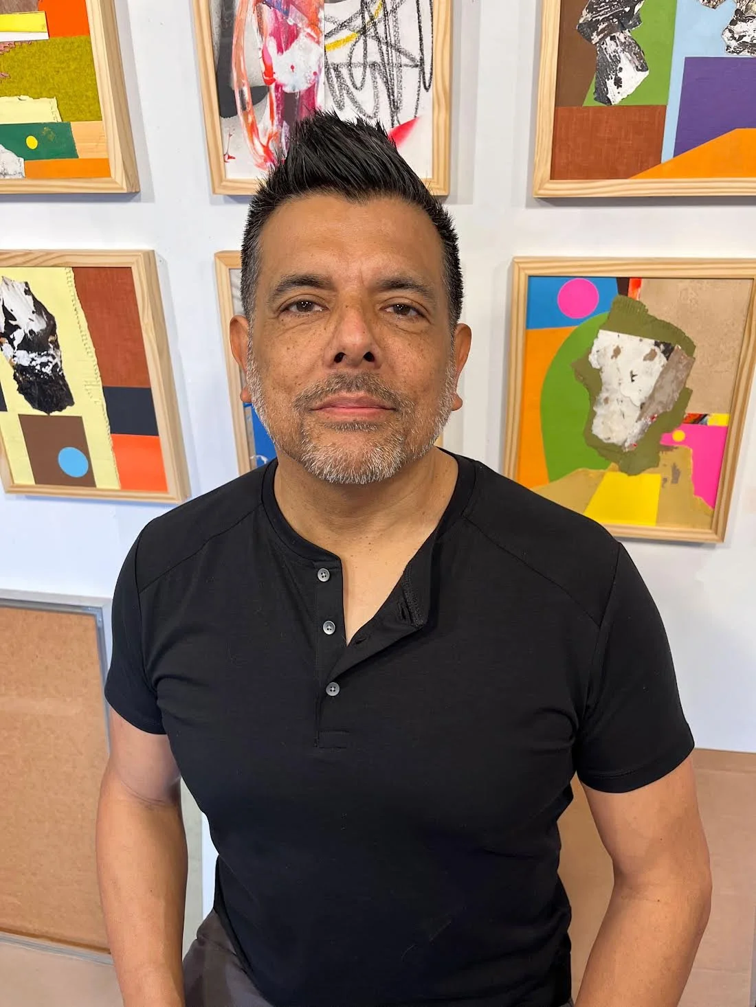 The physical part of my work includes painting and collaging with acrylics, pastels, and spray paints over canvas, fabrics, cardboard and other discarded material.